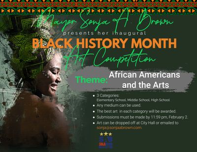 The Black History Month theme for 2024 is African Americans and the Arts. Artwork should be centered around that theme.